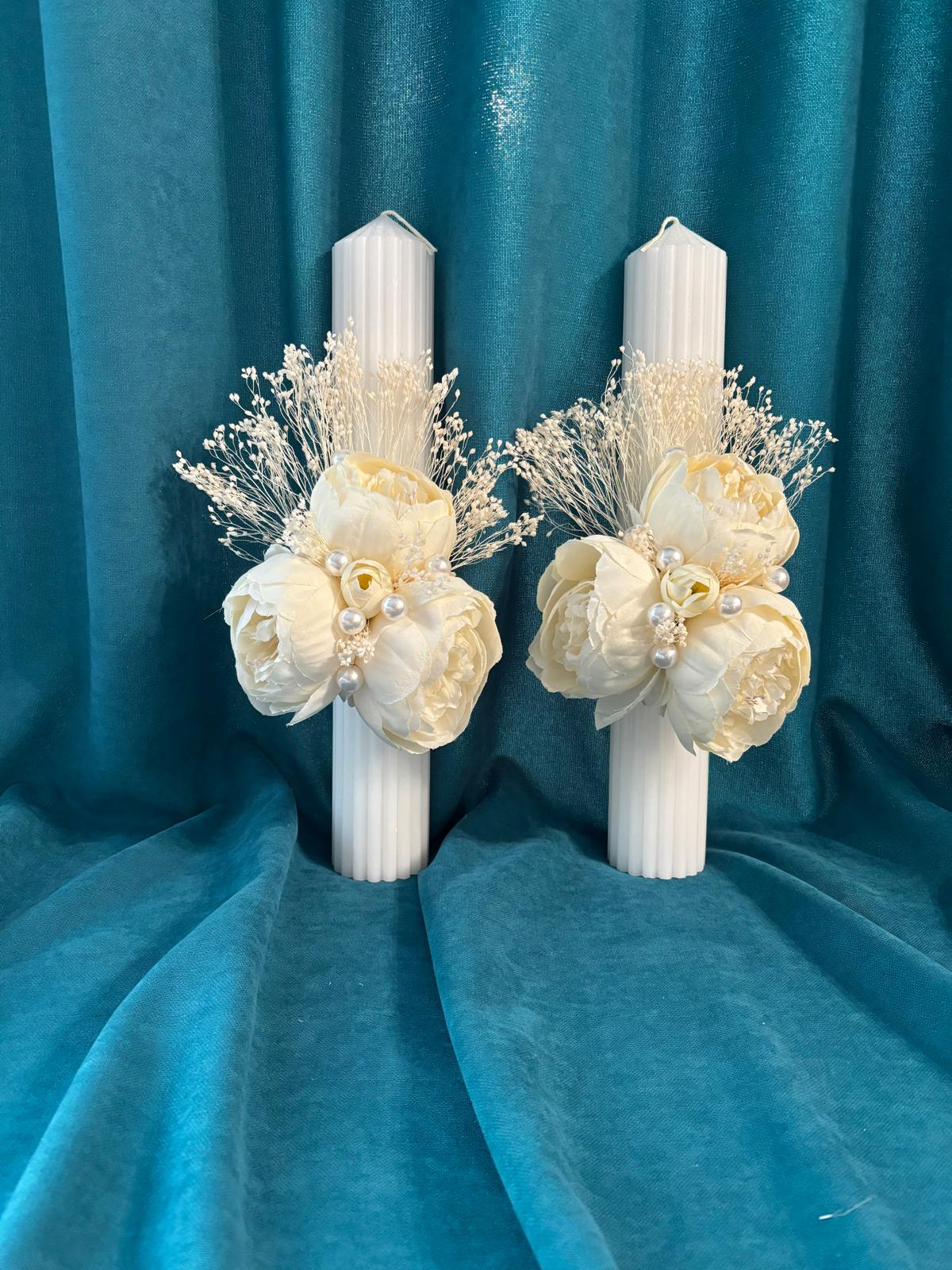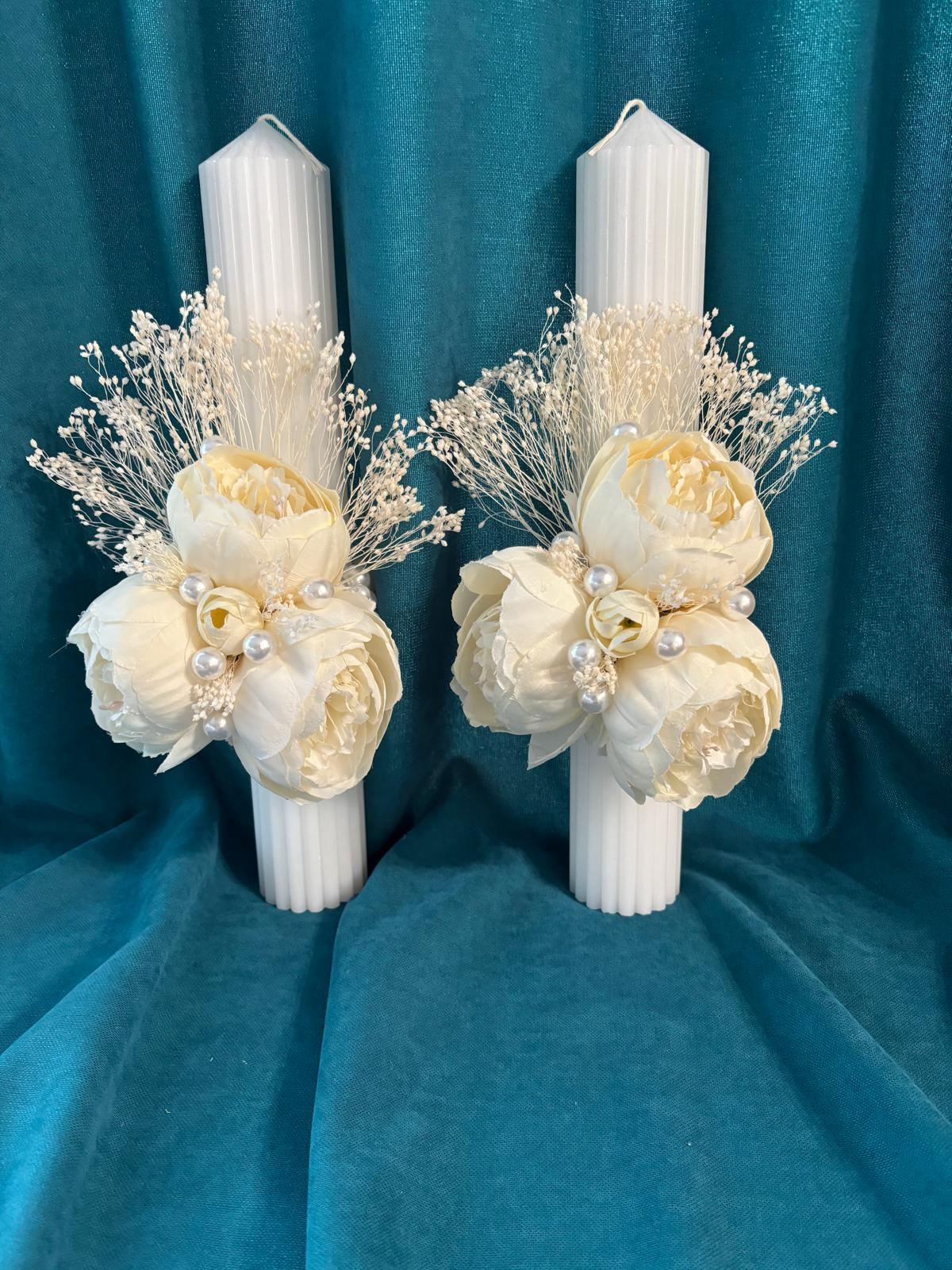 LUMANARI CANELATE PENTRU NUNTA REALIZATE HANDMADE CU BUJORI ALBI DIN MATASE, PLANTE USCATE SI PERLE.SE POATE PERSONALIZA. SE REALIZEAZA PE COMANDA IN CULORILE SI MODELUL DORIT.PENTRU COMENZI VA RUGAM SA NE CONTACTATI.