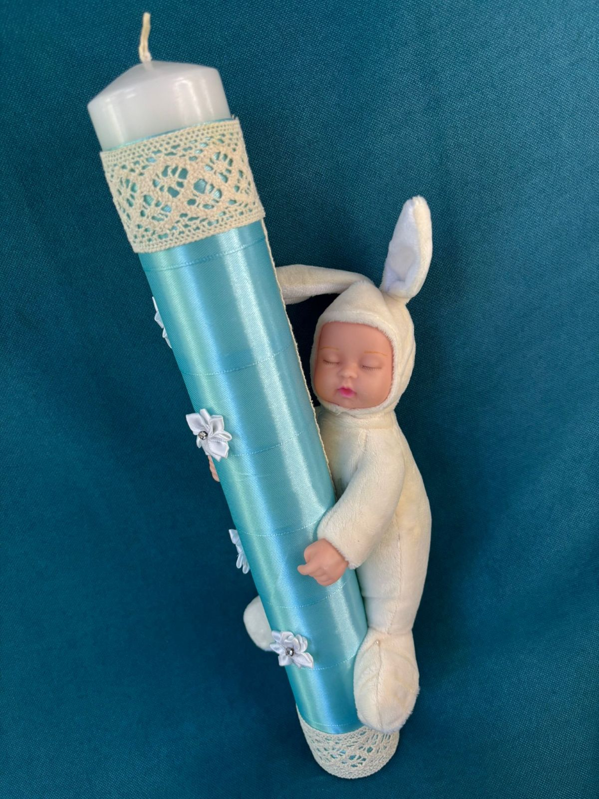 Lumanare pentru botez baietel, realizata handmade cu panglica bleu si bebe-iepuras, accesorizata cu floricele din saten.