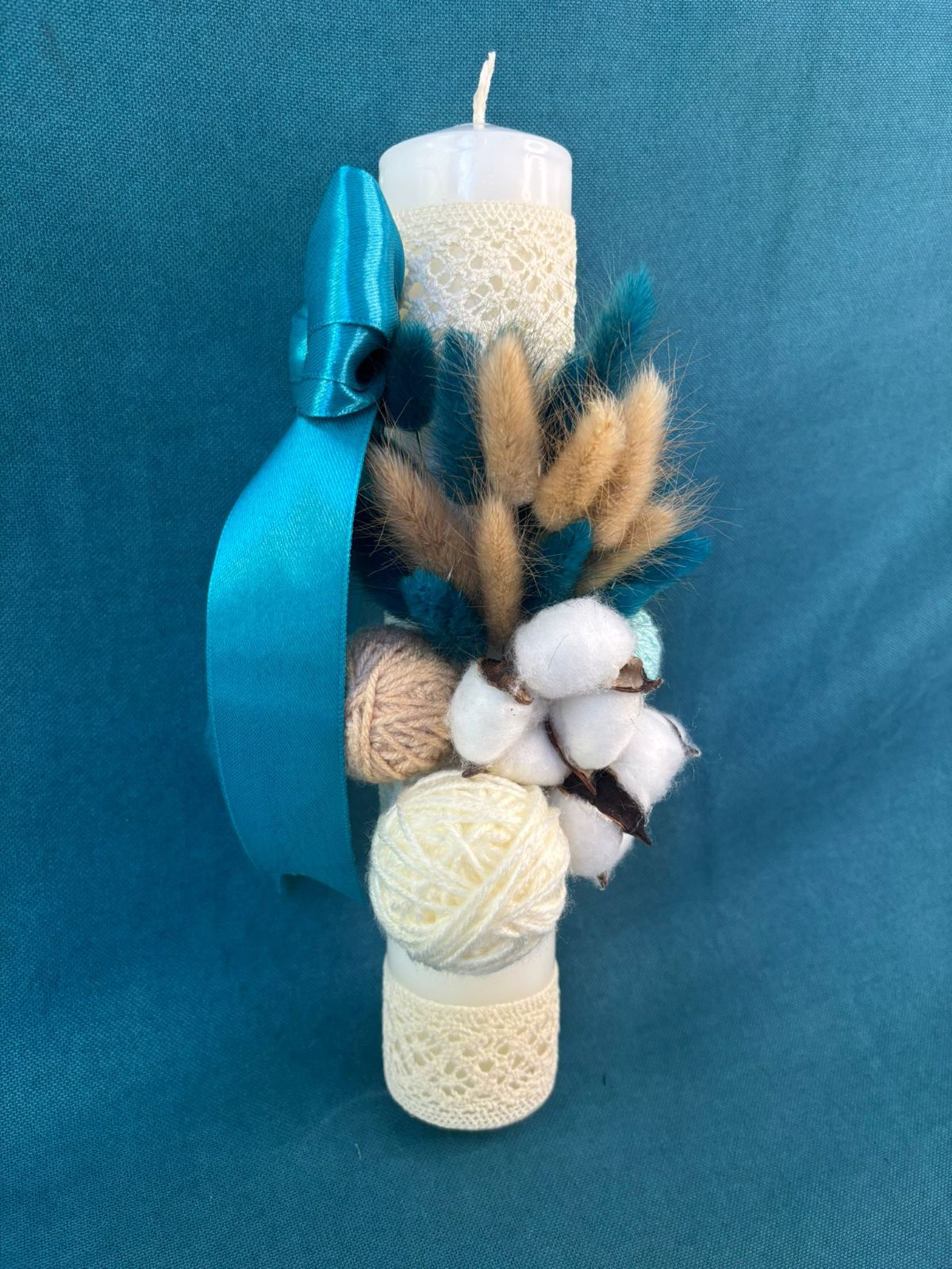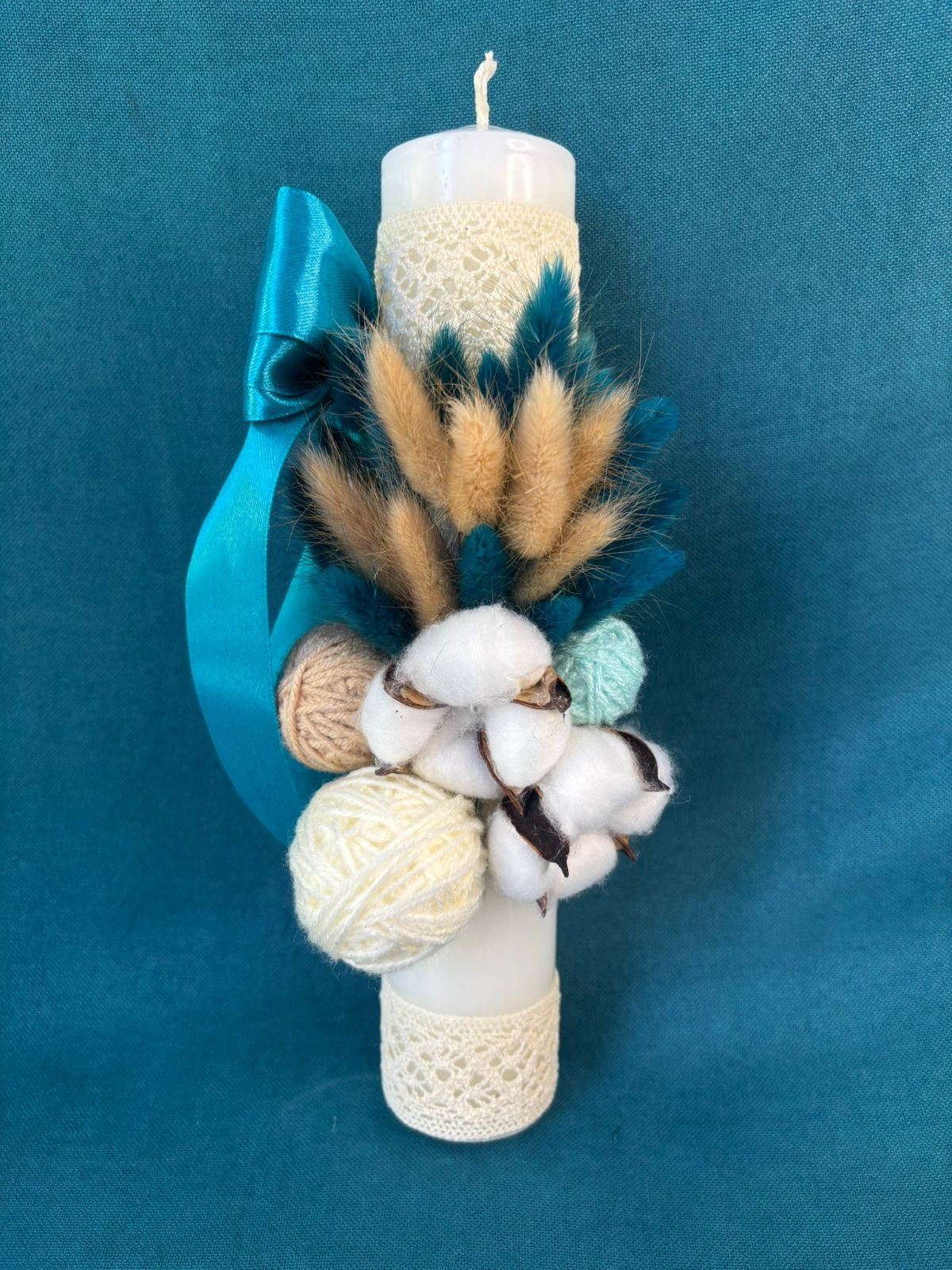 Lumanare din ceara realizata handmade cu gheme, plante naturale uscate (lagurus), bumbac si dantela, accesorizat cu panglica roz.