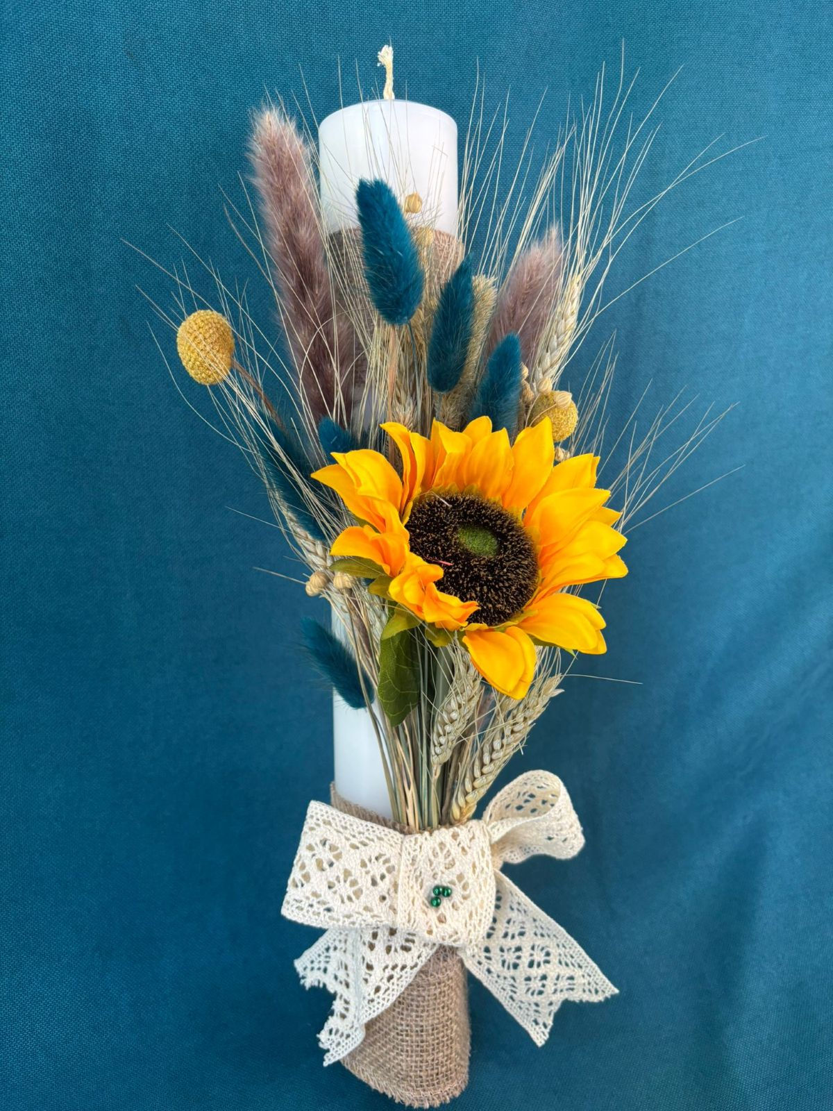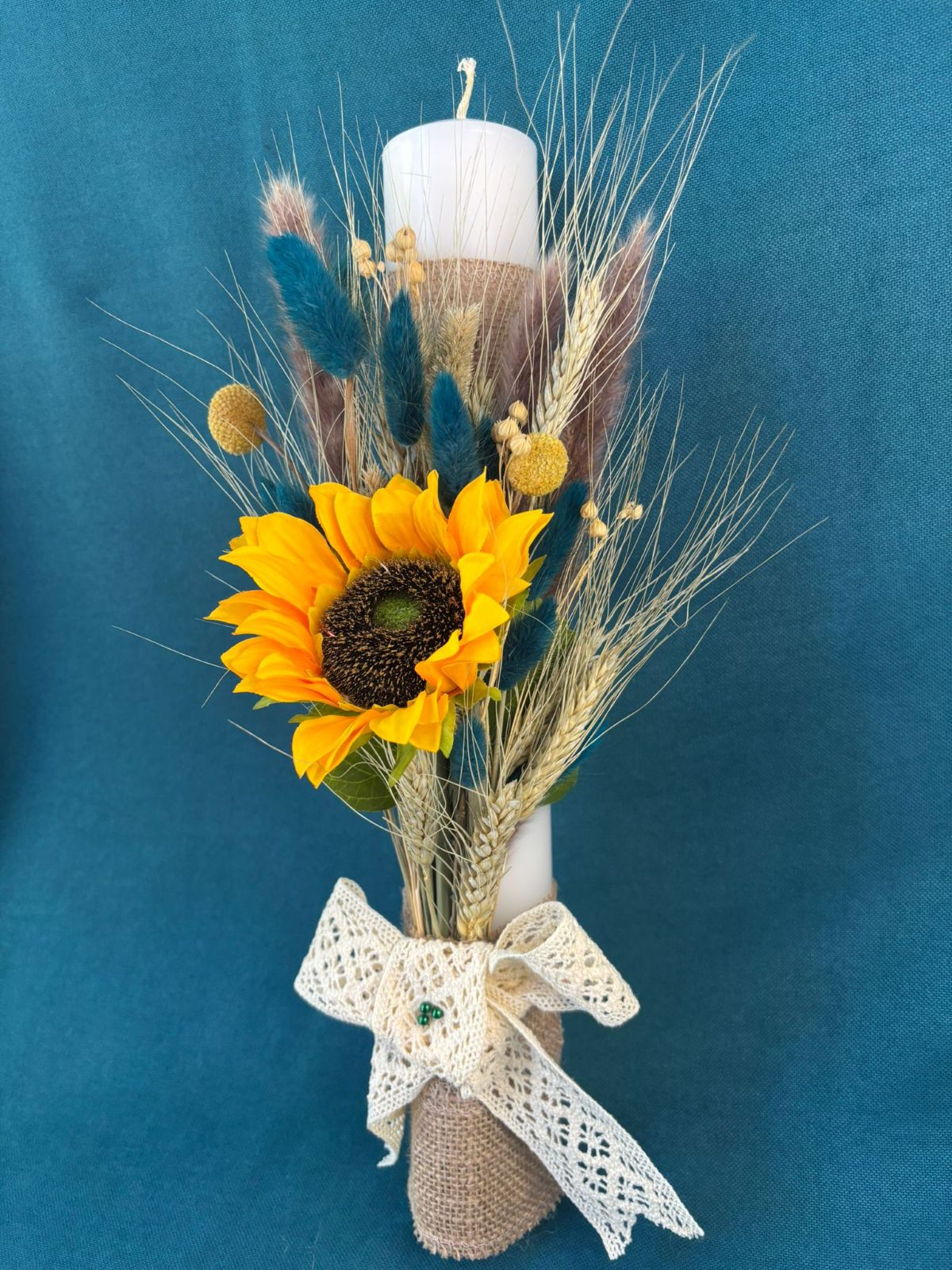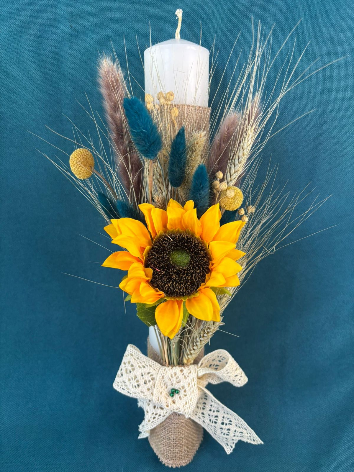 Lumanare din ceara realizata handmade cu floarea-soarelui(artificiala), plante naturale uscate (lagurus,spice de grau,bobite de in,..), panza de sac si dantela. Se poate personaliza dupa preferinte.Pentru comenzi va rugam sa ne contactati.
