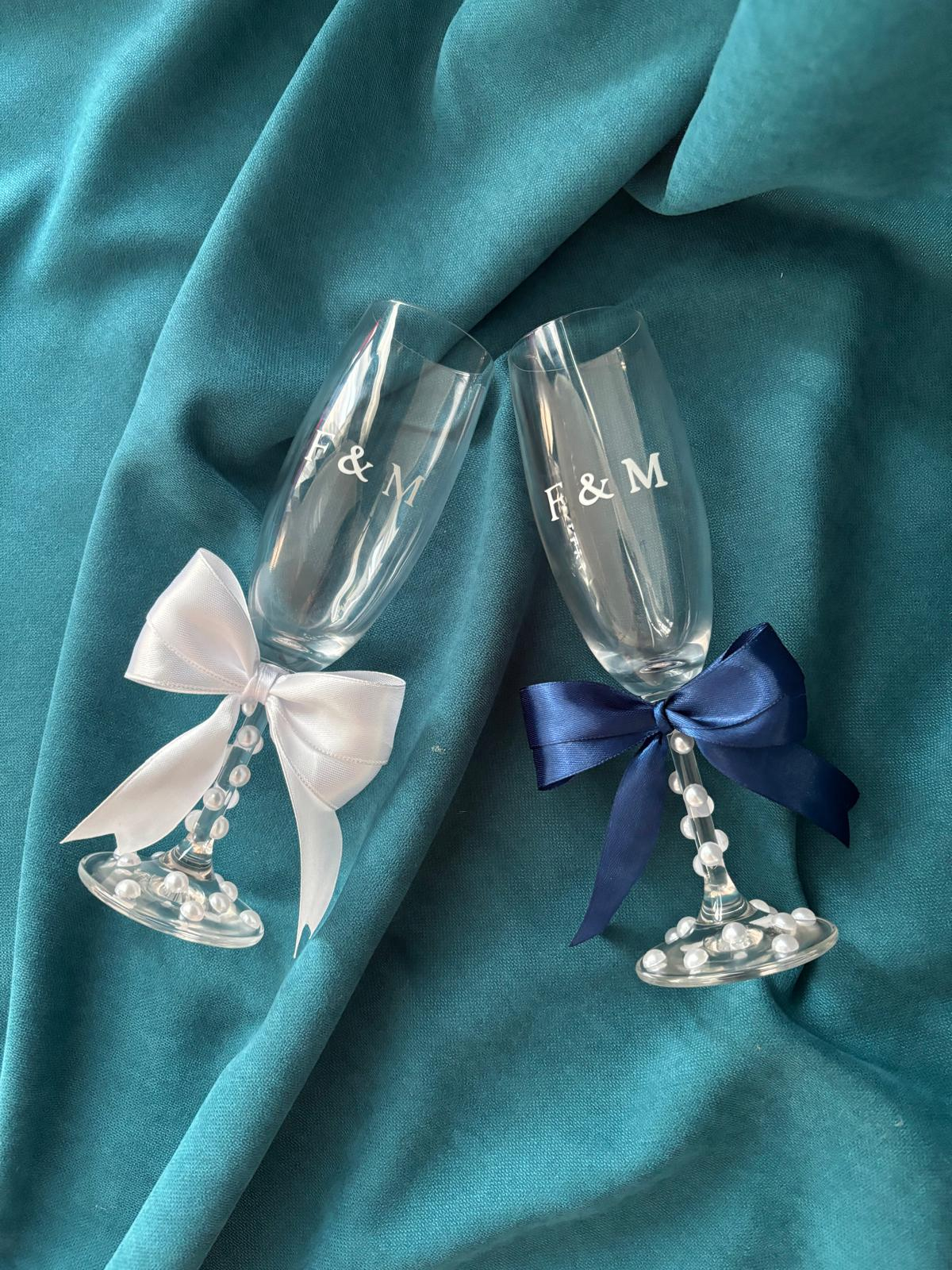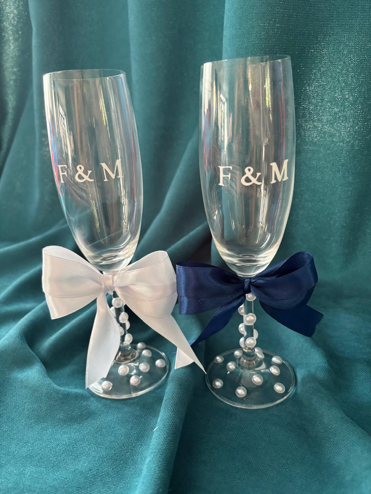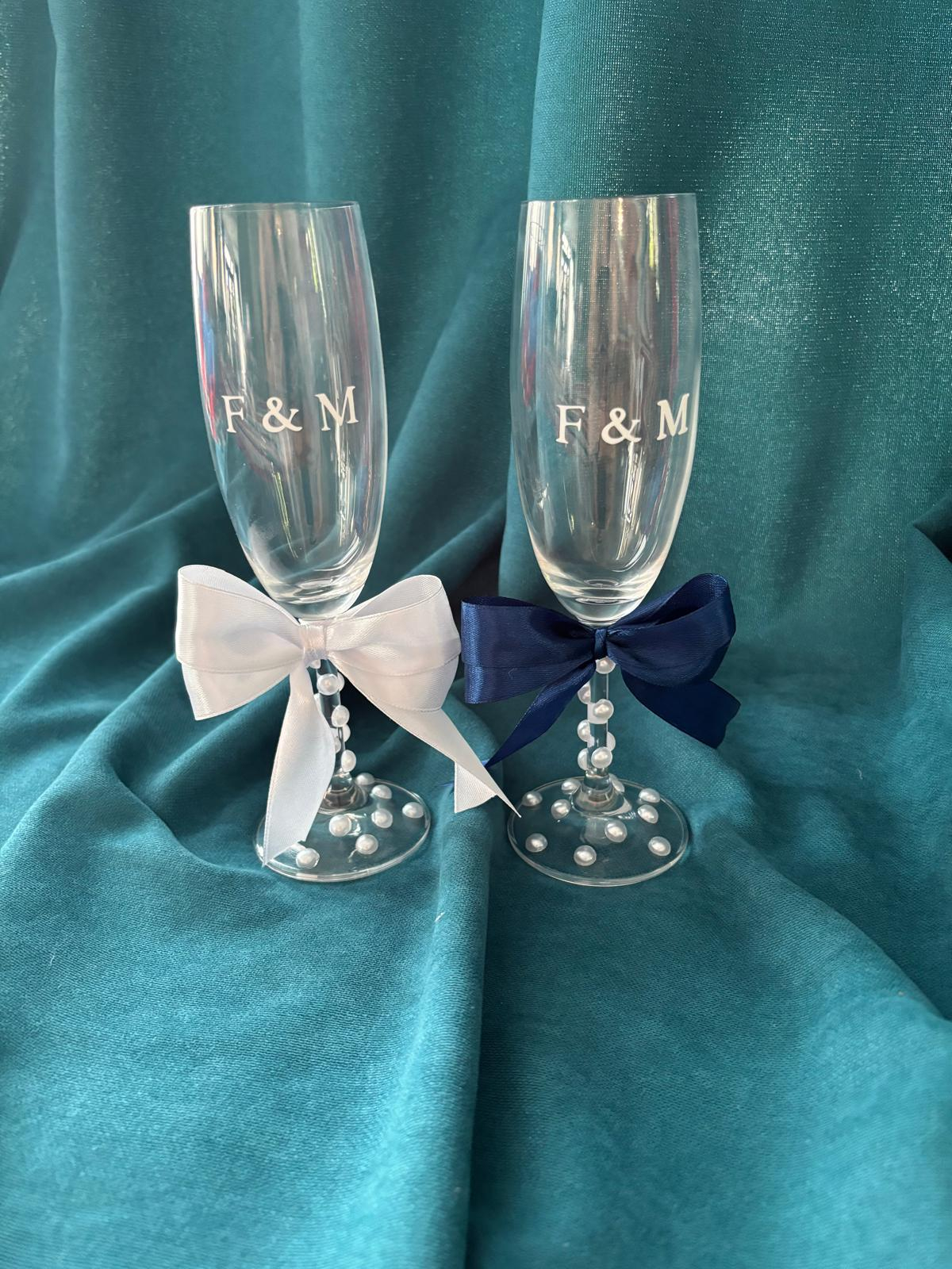 Pahare personalizate pentru miri si nasi, realizate handemade cu stickere, panglica si perle. Se realizeaza la comanda in culorite dorite. Pentru comenzi va rugam sa ne contactati.